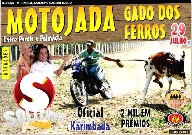 A Motojada de Gado dos Ferros deverá ser realizada pela segunda vez, caso não haja impedimento judicial. A “festa para derrubada do boi” promete distribuir R$ 2.000 em prêmios, além de três shows de bandas de forró. A expectativa de público é de dez mil pessoas e mais de 50 competidores.